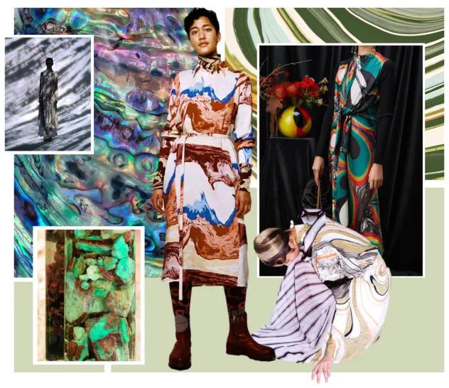 無(wú)機(jī)寶石中的松石、孔雀石、青金石皆擁有瑰麗的外表紋理,有機(jī)寶石中的鮑貝也為設(shè)計(jì)師帶來(lái)更多靈感,在印花技術(shù)高速發(fā)展的今天,我們擁有更多的選擇來(lái)呈現(xiàn)這些肌理之美,而傳統(tǒng)技法中的水拓印染法同樣可以帶來(lái)隨機(jī)流淌的美麗邂逅。