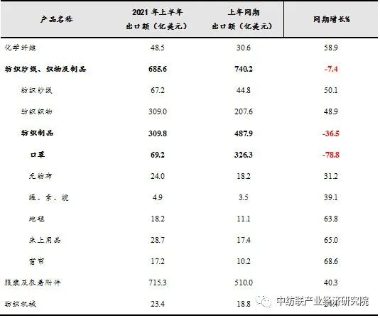 2021年上半年我國紡織產業鏈上主要商品出口表
