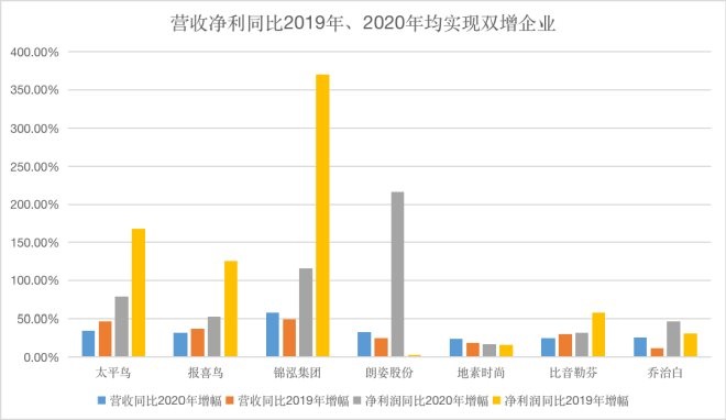 因此,我們同時將34家企業前三季度的營收、凈利 潤與2019年同期進行了比較。結果顯示,同比2019年、2020年均實現雙線增長的企業僅7家,分別是:太平鳥、報喜鳥、錦泓集團、朗姿股份、地素時尚、比音勒芬以及喬治白。而這7個品牌中營收超過50億元的,僅太平鳥一家。