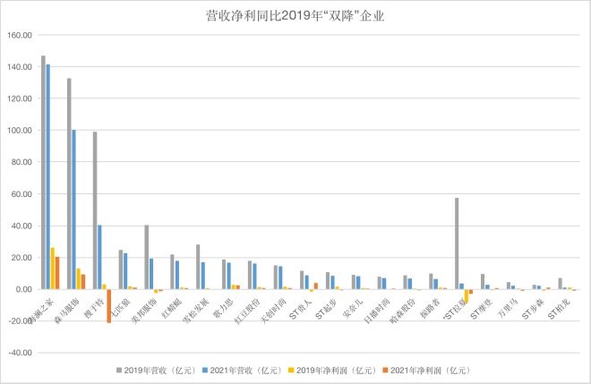 有雙增,自然也有雙降。據統計,34家企業中,營收、凈利 潤同比2019年業績“雙降”的企業高達21家,這也側面反映了多數服飾企業仍在緩慢爬坡,尚未恢復至疫情前水平。
