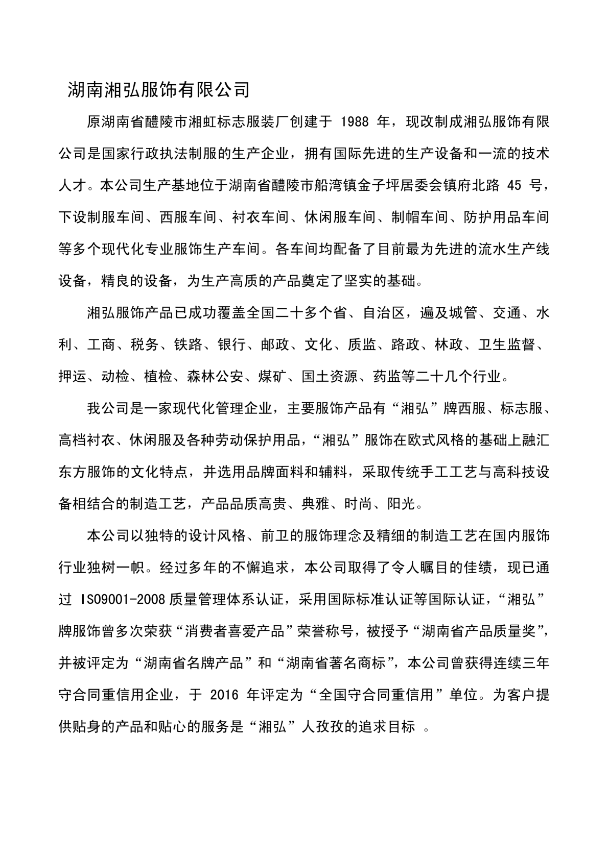 湖南湘弘服飾有限公司 原湖南省醴陵市湘虹標志服裝廠創建于1988年,現改制成湘服飾有限 公司是國家行政執法制服的生產企業,擁有國際先進的生產設備和一流的技術 人才。本公司生產基地位于湖南省醴陵市船灣鎮金子坪居委會鎮府北路45號, 下設制服車間、西服車間、襯衣車間、休閑服車間、制帽車間、防護用品車間 等多個現代化專業服飾生產車間。各車間均配備了目前最為先進的流水生產線 設備,精良的設備,為生產高質的產品奠定了堅實的基礎。 湘弘服飾產品已成功覆蓋全國二十多個省、自治區,遍及城管、交通、水 利、工商、稅務、鐵路、銀行、郵政、文化、質監、路政、林政、衛生監督、 押運、動檢、植檢、森林公安、煤礦、國土資源、藥監等二十幾個行業 我公司是一家現代化管理企業,主要服飾產品有“湘弘”牌西服、標志服 高檔襯衣、休閑服及各種勞動保護用品,“湘弘”服飾在歐式風格的基礎上融匯 東方服飾的文化特點,并選用品牌面料和輔料,采取傳統手工工藝與高科技設 備相結合的制造工藝,產品品質高貴、典雅、時尚、陽光。 本公司以獨特的設計風格、前衛的服飾理念及精細的制造工藝在國內服飾 行業獨樹一幟。經過多年的不懈追求,本公司取得了令人矚目的佳績,現已通 過IS09001-2008質量管理體系認證,采用國際標準認證等國際認證,“湘弘” 牌服飾曾多次榮獲“消費者喜愛產品”榮譽稱號,被授予“湖南省產品質量獎” 并被評定為“湖南省名牌產品”和“湖南省著名商標”,本公司曾獲得連續三年 守合同重信用企業,于2016年評定為“全國守合同重信用”單位。為客戶提 供貼身的產品和貼心的服務是“湘弘”人孜孜的追求目標。