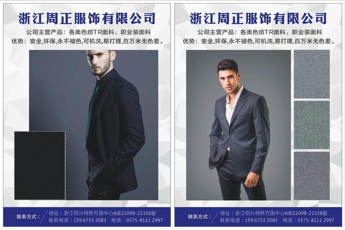 浙江周正服飾有限公司于2014年1月份成立,是紹興斯威特(Sweit)服裝紡織有限公司(建立于2004年)的一個子公司。它坐落于亞洲最大的輕紡市場——柯橋,并以中國紡織基地而聞名。我們既是梭織、針織和其它服裝面料的生產商,也是批發商。作為一個大型的紡織公司,我們擁有規模相當大的坯布織工廠供應商。我們擁有精湛的技術以及三條先進的生產線和一套全面的紡織及其它的整理設備。 周正服飾致力于研究與發展,生產與銷售各式各樣的服裝面料,尤其對西服面料的經營。如上所述,我們擁有著優藝的技術,并同時專營于高檔的服裝面料,包括T/R面料,T/R/W面料,T/T面料和滌綸面料。在科學的管理和先進的高技術引領下,我們的產品設計和服裝色彩都緊跟國際時尚潮流。 “顧客第一、誠信與質量優先”是我們長期以來的服務宗旨。優良的產品和具有競爭性的價格證實我們在過去的十年一直在世界服裝市場占有一席之地。我們的產品之所以可以銷售地很好,就是因為我們根據國際標準嚴格檢驗。由此,我們也獲得了良好的信譽和98.5%的顧客滿意度。 我們真誠地歡迎您的到訪,并請聯系我們以便進一步了解。我們會用專業的服務及時回答您的任何問題,以此實現我們雙贏的目標!